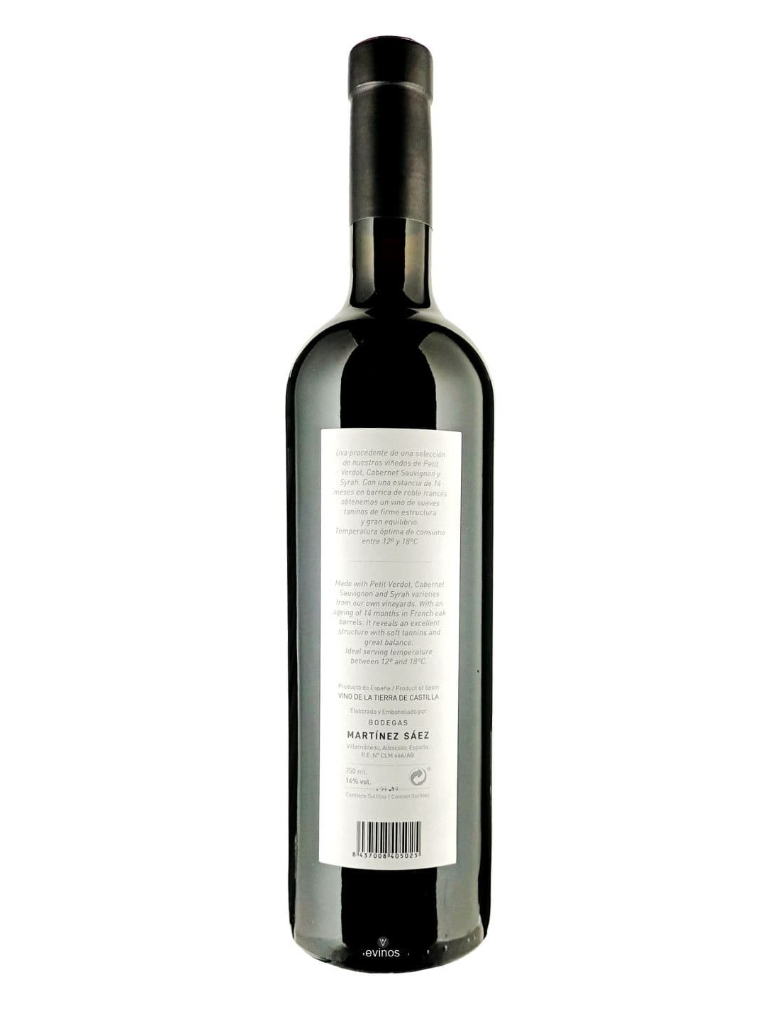 Elaborado con las variedades de uvas Petit Verdot, Cabernet Sauvignon y Syrah, de viñedos procedente de un único pago junto a la bodega situada en Villarrobledo.